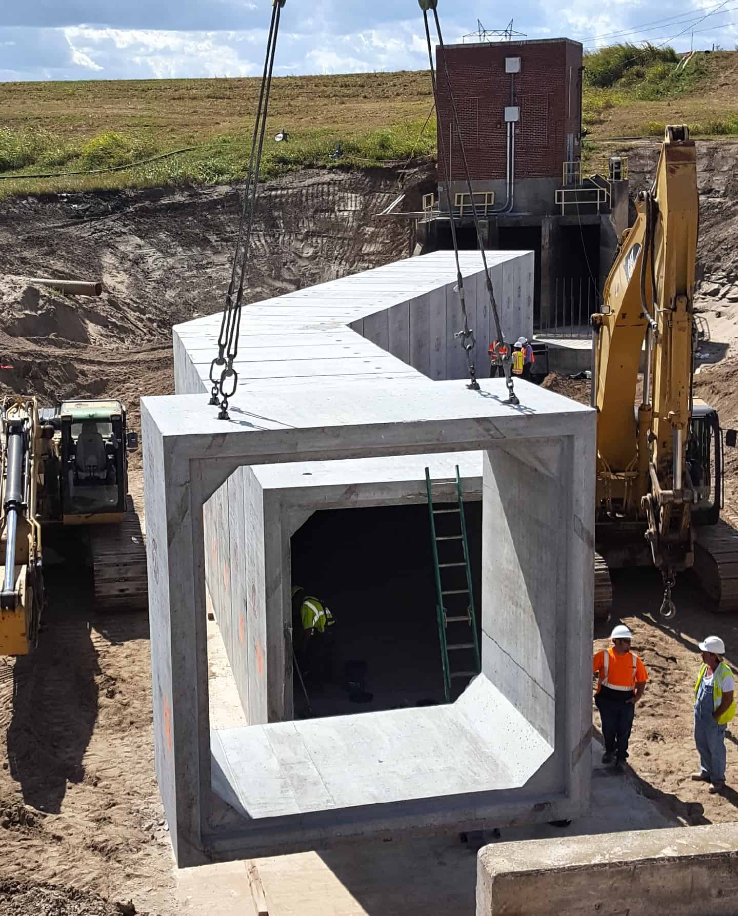 Size: 12″ thick precast panels, 119′-4″ long, between 22′-6″ and 27′-6″ tall