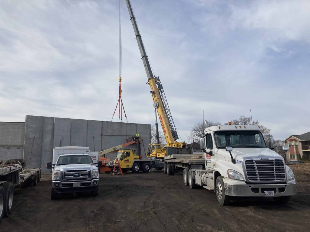 Wieser Concrete also used fire-rated caulk and backing to meet the proper rating. At 119′-4″ in total length, the firewall slopes from 27′-6″ tall down to 22′-6″ tall. The panels consist of 12″ thick insulated precast concrete and include a custom cut-out for an 18′ x 10′ overhead door. Installation was completed in just two days from start to finish. Badger Corrugating will use the new space for prefinished lumber and raw lumber storage.